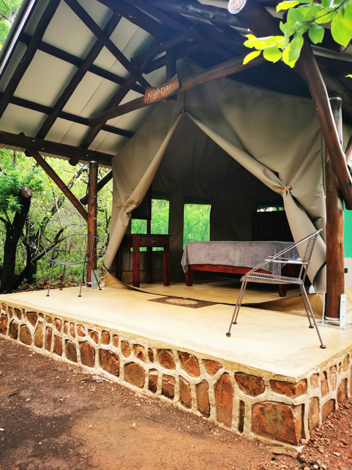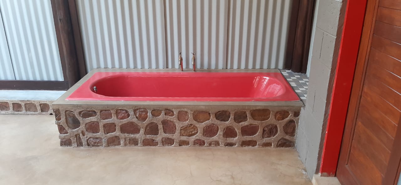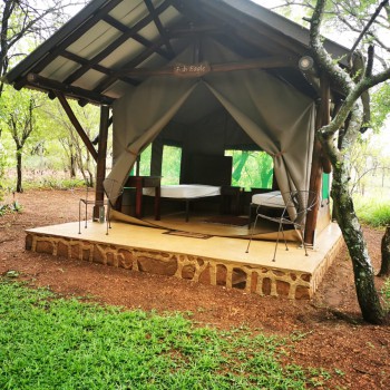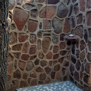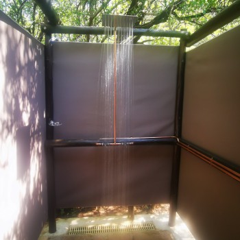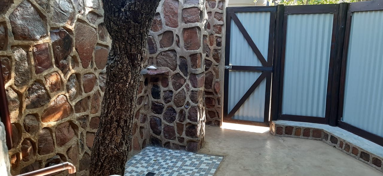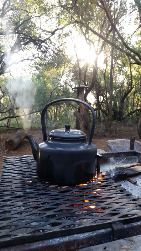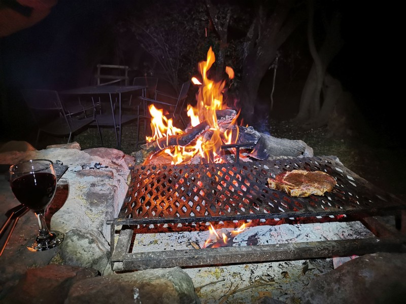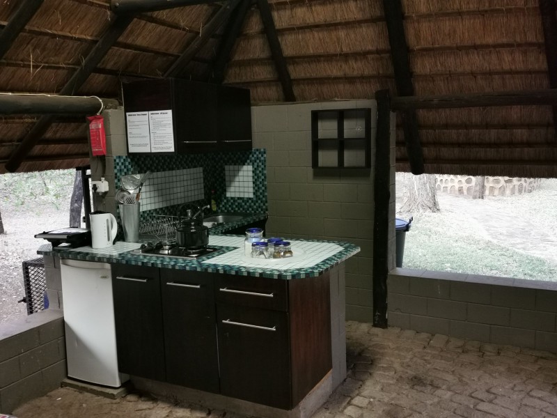 The camp has a Lapa with a small kitchenette. The kitchenette is equipped with a small gas hob, warm water, a kettle, toaster, sandwich press, electric frying pan and cutlery & crockery. There is enough cutlery, crockery & glasses for 20x guests. There are also pots, pans, cooking utensils, a No 4 Potjie, Dutch Oven and two “varkie ovens” for making bread on the fire in. The kitchenette is also equipped with a small bar fridge.