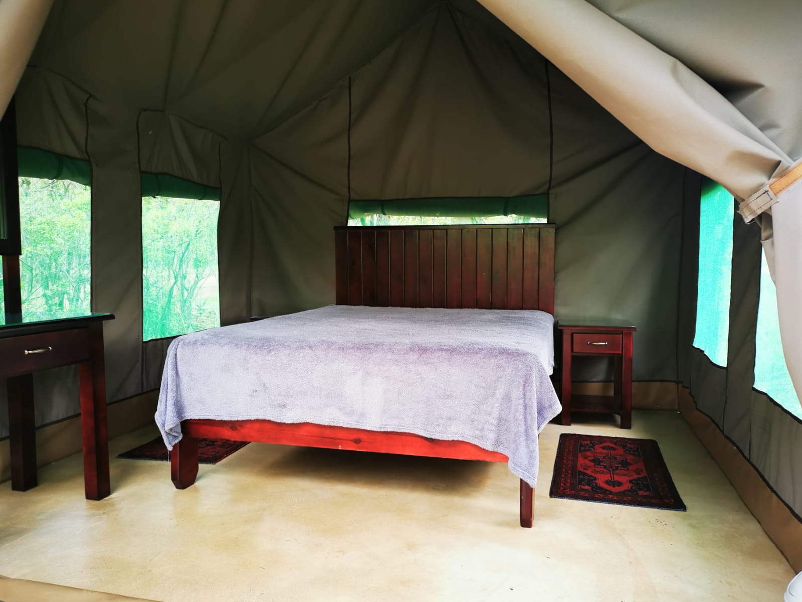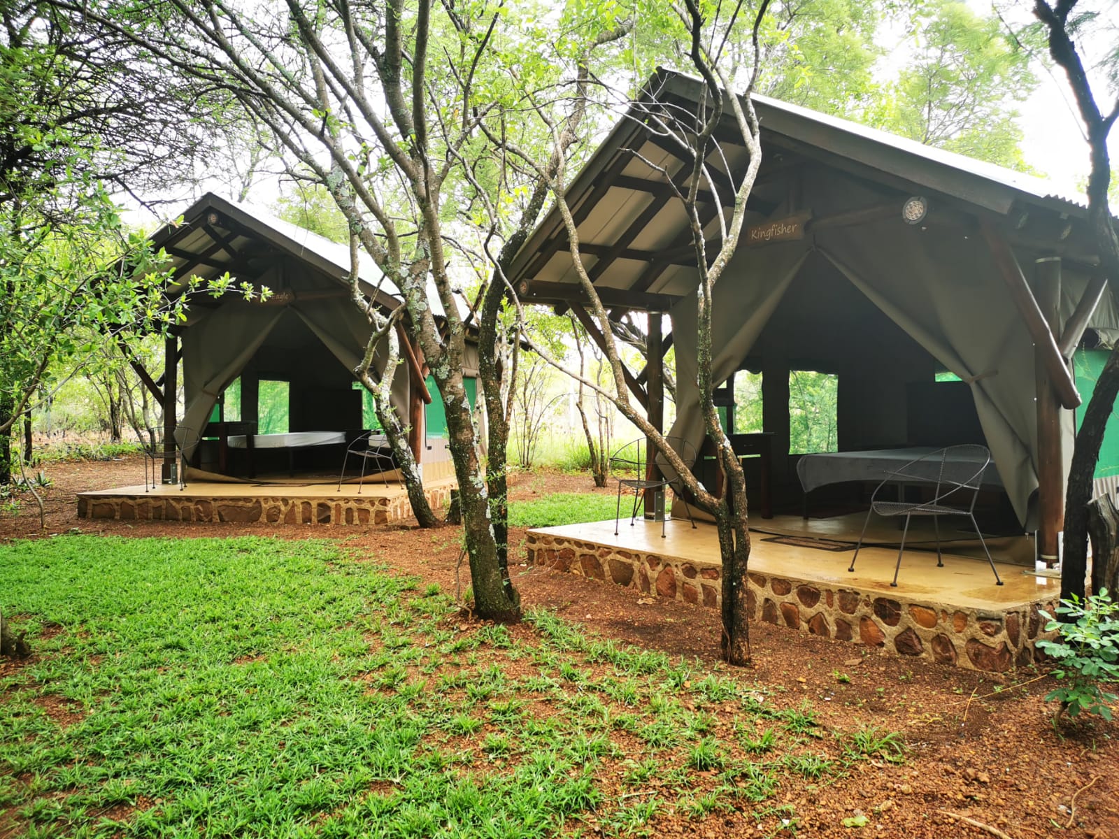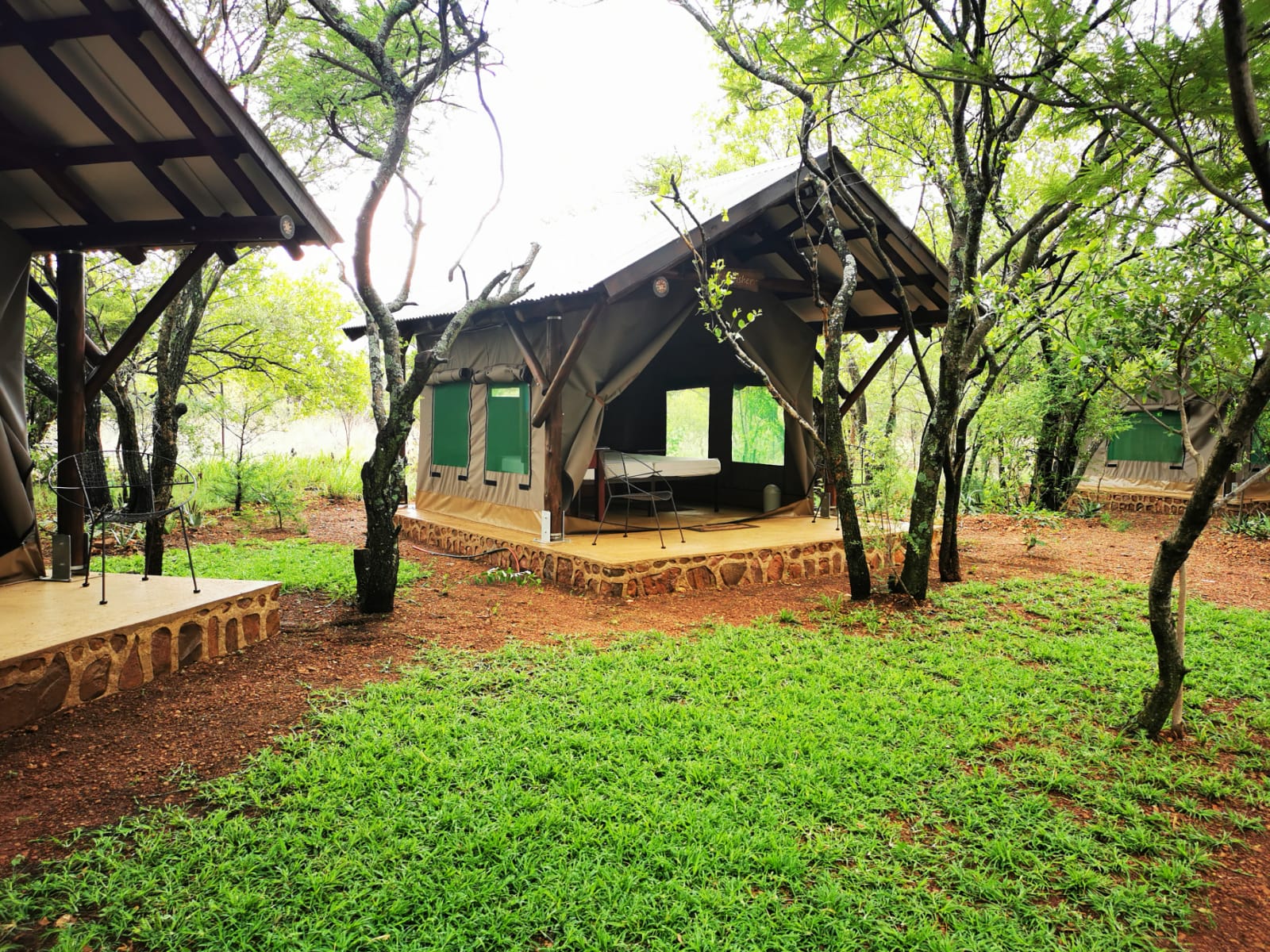 The camp has a Lapa with a small kitchenette. The kitchenette is equipped with a small gas hob, warm water, a kettle, toaster, sandwich press, electric frying pan and cutlery & crockery. There is enough cutlery, crockery & glasses for 20x guests. There are also pots, pans, cooking utensils, a No 4 Potjie, Dutch Oven and two “varkie ovens” for making bread on the fire in. The kitchenette is also equipped with a small bar fridge.